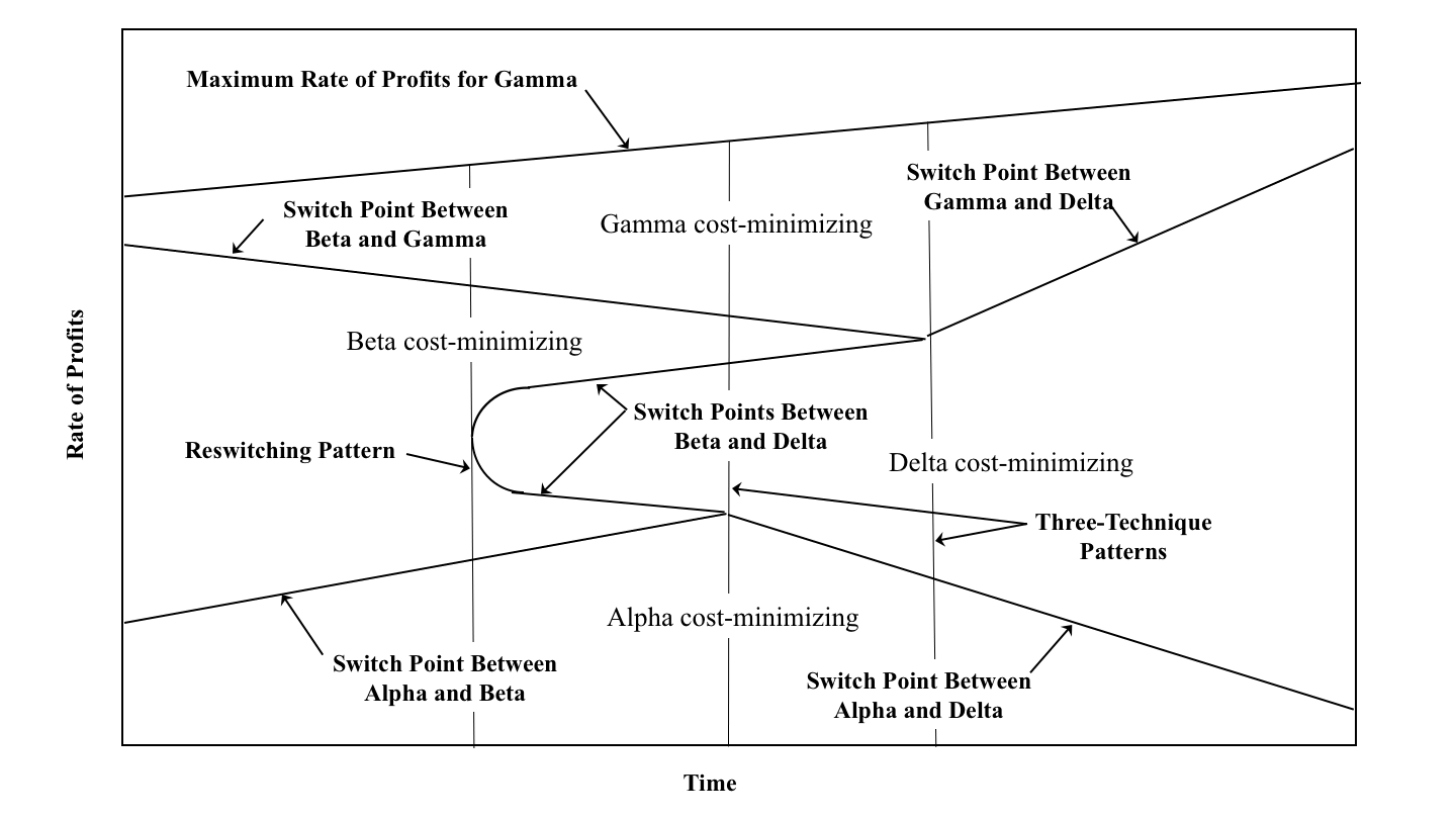 Figure 1, above, illustrates the first possibility. These illustrations are only schematic; the illustrated curves need not be straight lines. In the first pattern, two three-technique patterns succeed one another in time. A three-technique pattern arises when a switch point on the frontier is an intersection of the wage curves for three techniques. For the temporally first three-technique pattern, a switch point is replaced by two switch points, with a new technique being cost-minimizing for rates of profits between the two switch points. Four techniques, instead of three techniques, now lie on the wage frontier. For the later three-technique pattern, two switch points are replaced by one switch point. The middle technique at the original point in time is no longer cost-minimizing, for any rate of profits. The postulated initial sequence of techniques occurs before the first pattern, and the final sequence occurs after the second pattern.