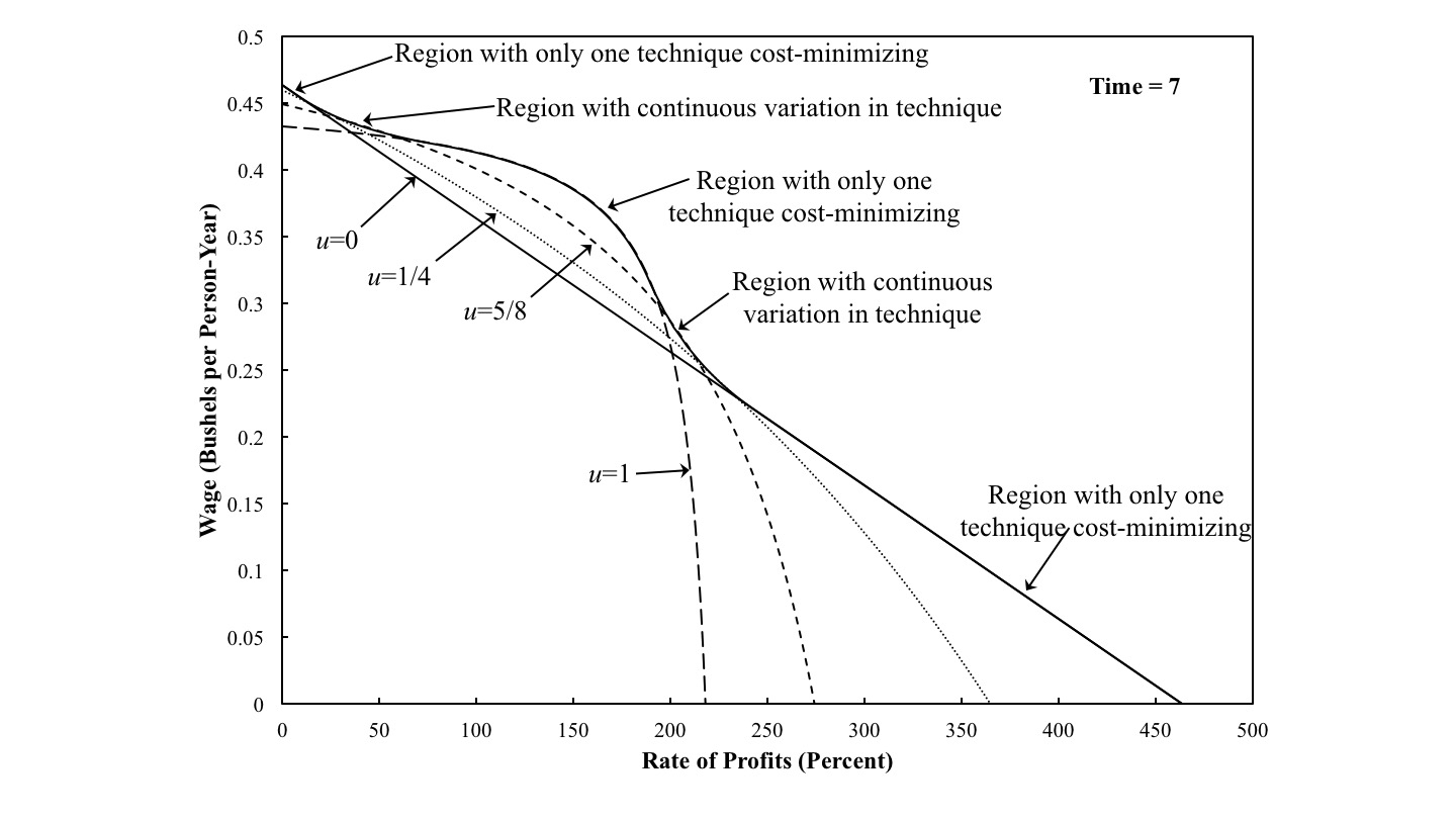 Recurrence Of Techniques Without Switch Points I have built on my previous post in a writeup: Abstract: In certain models of commodities produced by means of commodities, the choice of technique is analyzed by the construction of the wage frontier. This article presents a numeric example of a continuum of wage curves tangent at a switch point. Technological progress leads to the recurrence of techniques. No switch points then exist, but the cost-minimizing technique varies continuously along the wage frontier. Further progress leads to the disappearance of the recurrence of techniques and, eventually, a single technique becoming cost-minimizing for all feasible rates of profits.