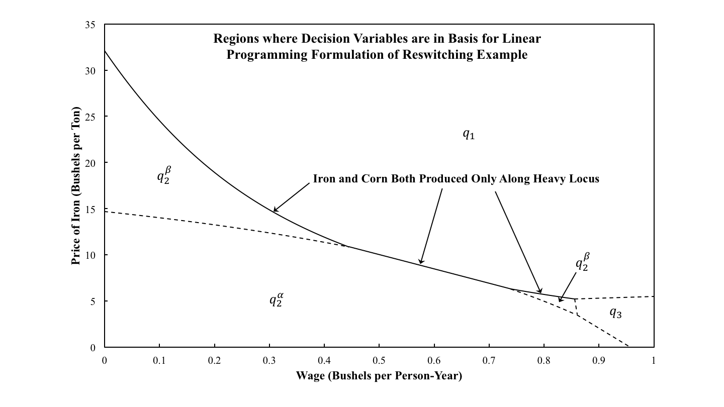 The solution to the primal LP, in a two-commodity example, is easily visualized. Figure 1 partitions the space formed from the price of iron and the wage. A single decision variable enters the basis inside each region in the figure, and that region is labeled by that decision variable. On the boundaries, a solution to the LP can be formed from a linear combination of decision variables. Iron and corn must be both produced for the economy to be self-sustaining. Firms are willing to produce both only if prices lie along the heavy locus. The figure shows that this is a reswitching example. The Beta technique is adopted at low and high wages, while the Alpha technique is used at intermediate wages. The figure also illustrates that the wage cannot exceed a maximum.
