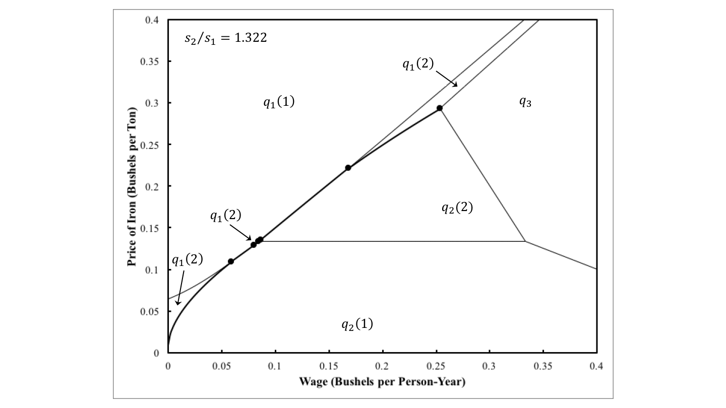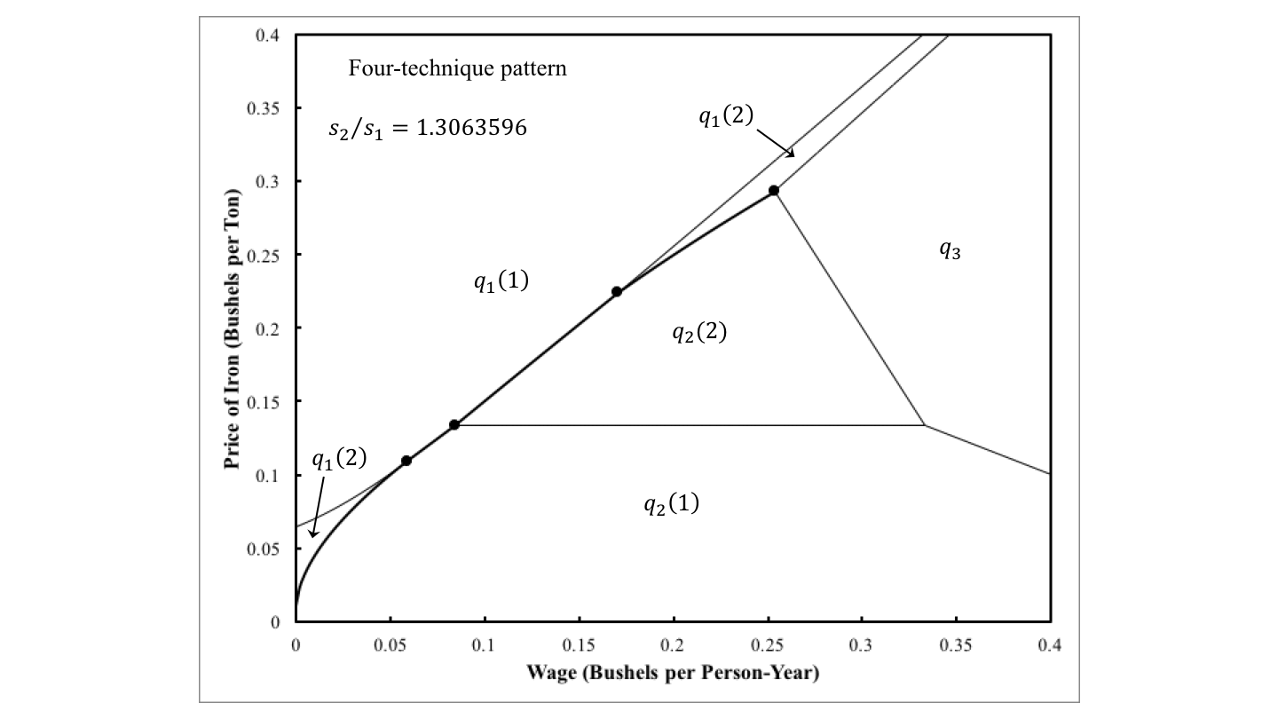 I analyze the choice of technique by analyzing the solution of a linear program for a cost-minimizing firm. Figure 2 illustrates. (I have this figure wrong in my working paper.) Above the heavy locus, firms are willing to only produce iron. The regions in which profit-maximizing firms are willing to adopt each iron-producing process are indicated. Below the heavy locus, firms are only willing to produce corn. This region is also partitioned by the two corn-producing process.