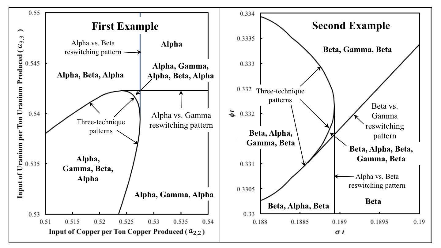 The left panel in Figure 1 above partitions a portion of the parameter space for this model. I label each region by the cost-minimizing techniques along the wage frontier, in the order of an increasing rate of profits. The partitions are labeled by the corresponding pattern of switch points. This case illustrates how a perturbation of coefficients of production can lead to the emergence of the reswitching of techniques.