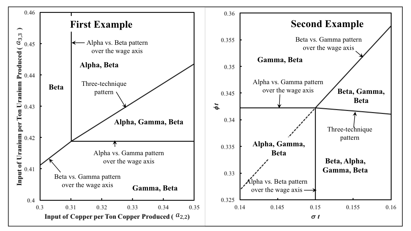 This generic structure in these parameter spaces is obscured by the dotted line in the panel on the right. Along it, the wage curves for the switch point between the Beta and Gamma techniques intersect at a rate of profits of zero. But this switch point is not on the wage frontier. Below and to the right of the dotted line, the switch point between Beta and Gamma on the frontier exhibits capital-reversing, while above it that switch point has a negative real Wicksell effect. Thus, the dotted line is not associated with a change in the number of sequence of switch points along the wage frontier. But it is associated with the change of the direction of real Wicksell effects around one of these switch points.