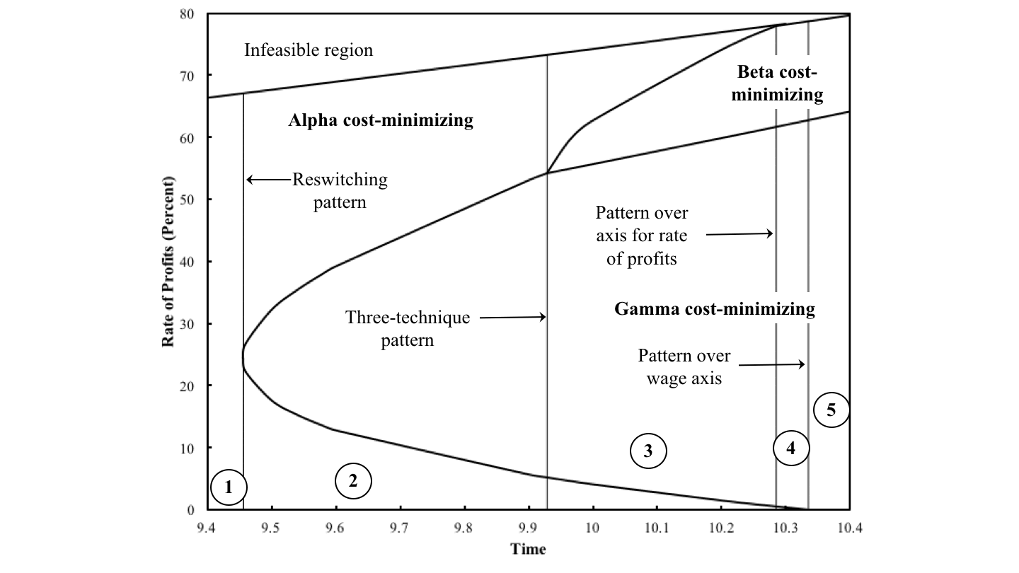 I have invented graphs for visualizing how the analysis of the choice of technique varies with perturbations of parameters in models of prices of production. This post presents some examples of one type of diagram. One must click on a link with each graph, I guess, to fully understand what is being depicted.