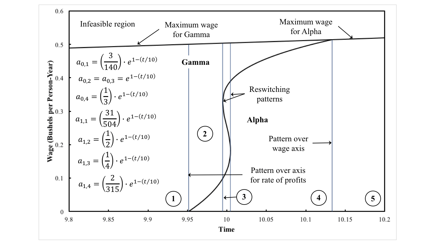 Figure 1 is an extension of an example from Betram Schefold (21 May 2020). This example concerns technological progress and the economic life of a machine in an example of pure fixed capital.